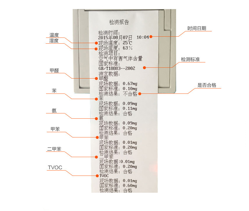 ▲現(xiàn)場(chǎng)測(cè)定甲醛含量,并可打印出甲醛、苯、氨、甲苯、二甲苯、TVOC、溫度、濕度、八項(xiàng)檢測(cè)結(jié)果。