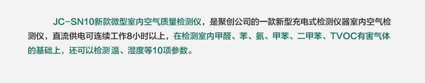 JC-SN10新款微型室內(nèi)空氣質(zhì)量檢測(cè)儀,是聚創(chuàng)公司的一款新型室內(nèi)空氣檢測(cè)儀,是目前國(guó)內(nèi)較少的一款充電式檢測(cè)儀器,其內(nèi)置大容量鎳氫電池,交、直流兩用供電方式,直流供電可連續(xù)工作8小時(shí)以上,在檢測(cè)室內(nèi)甲醛、苯、氨、甲苯、二甲苯、TVOC有害氣體的基礎(chǔ)上,還可以檢測(cè)溫、濕度等10項(xiàng)參數(shù),是目前國(guó)內(nèi)較少的一款十合一產(chǎn)品。